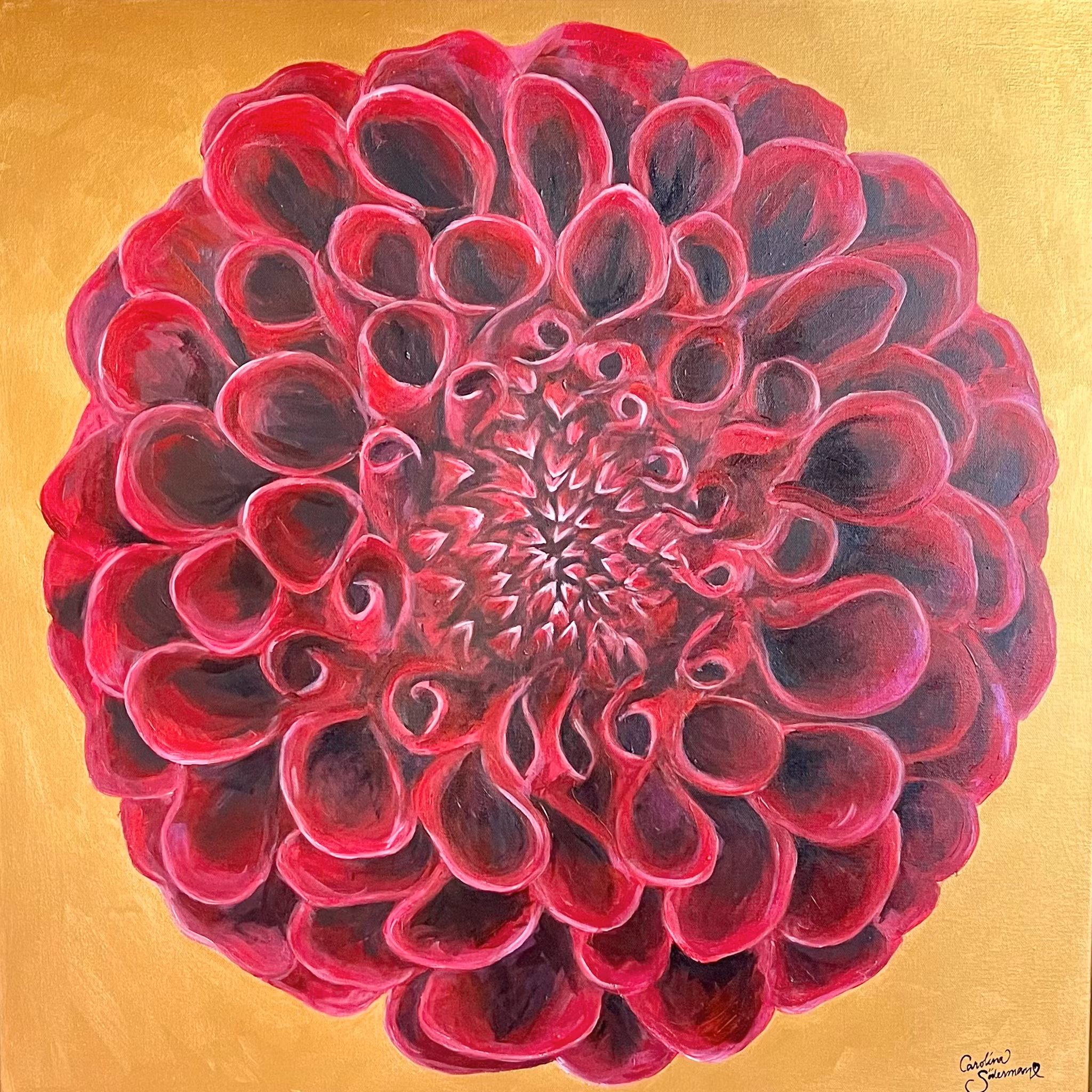 Originalmålning av Carolina Söderman, akryl på canvas. Mått 80x80 cm. Blommornas blomma, Dahlian och mandalan har många likheter. Naturens vidunderliga symmetri svävar här på en himmel av guld. Canvasen har ett djup på 3,5 cm.