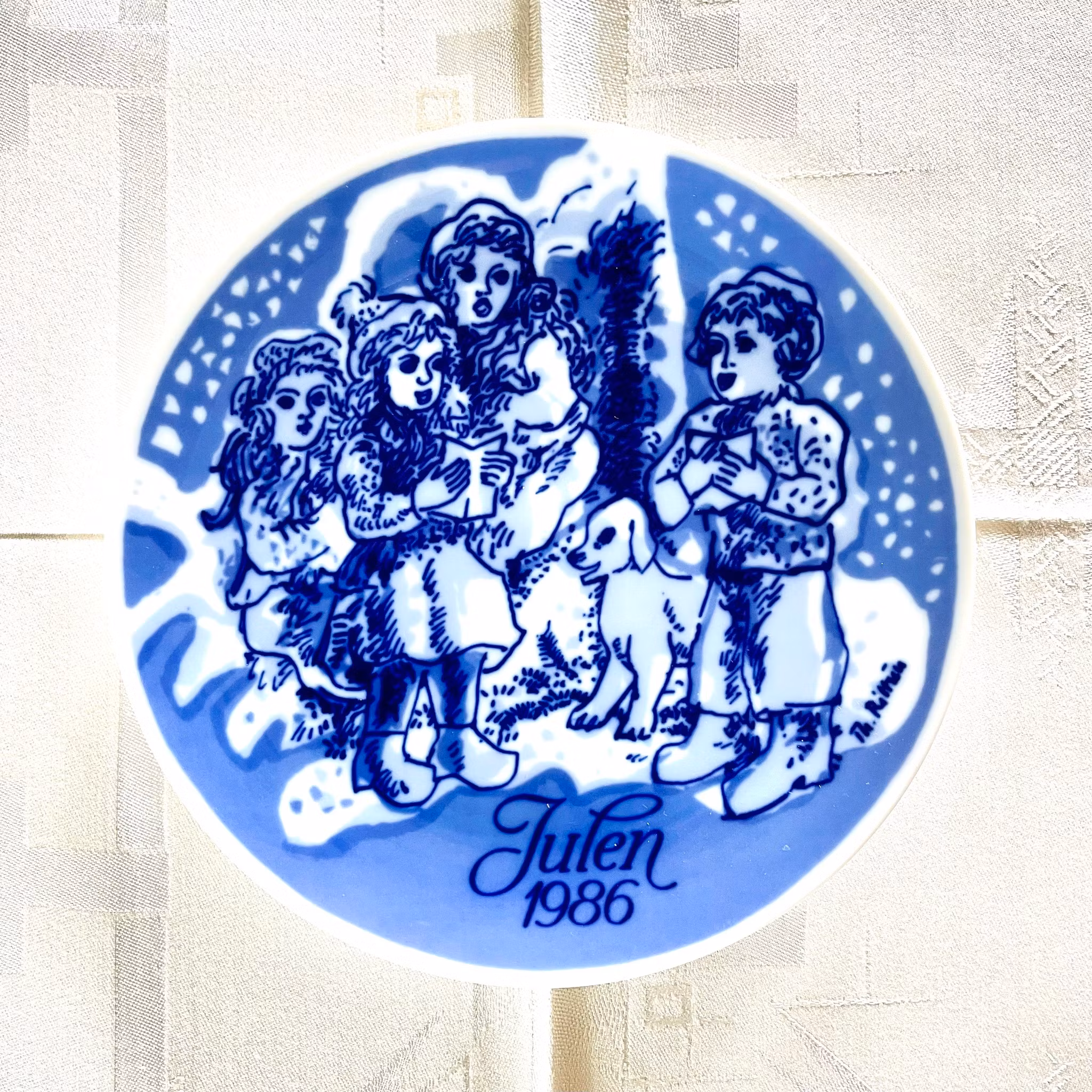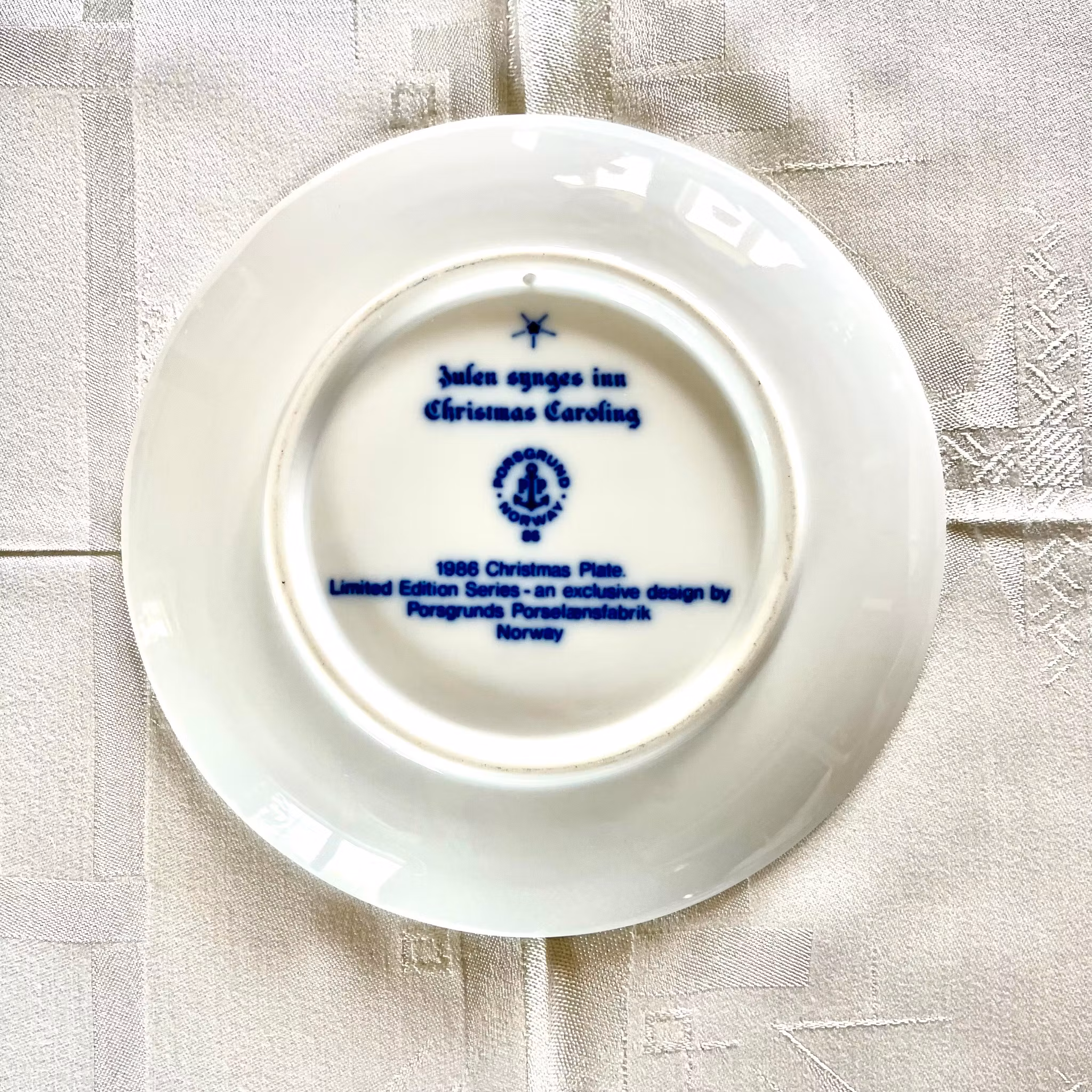 Jultallrik 1986 från norska Porsgrunds porslinsfabrik med motivet ”Julen syntes inn/Christmas caroling”. Häng upp på väggen eller använd dom assiett. Diameter 18 cm. Obetydligt bruksslitage.