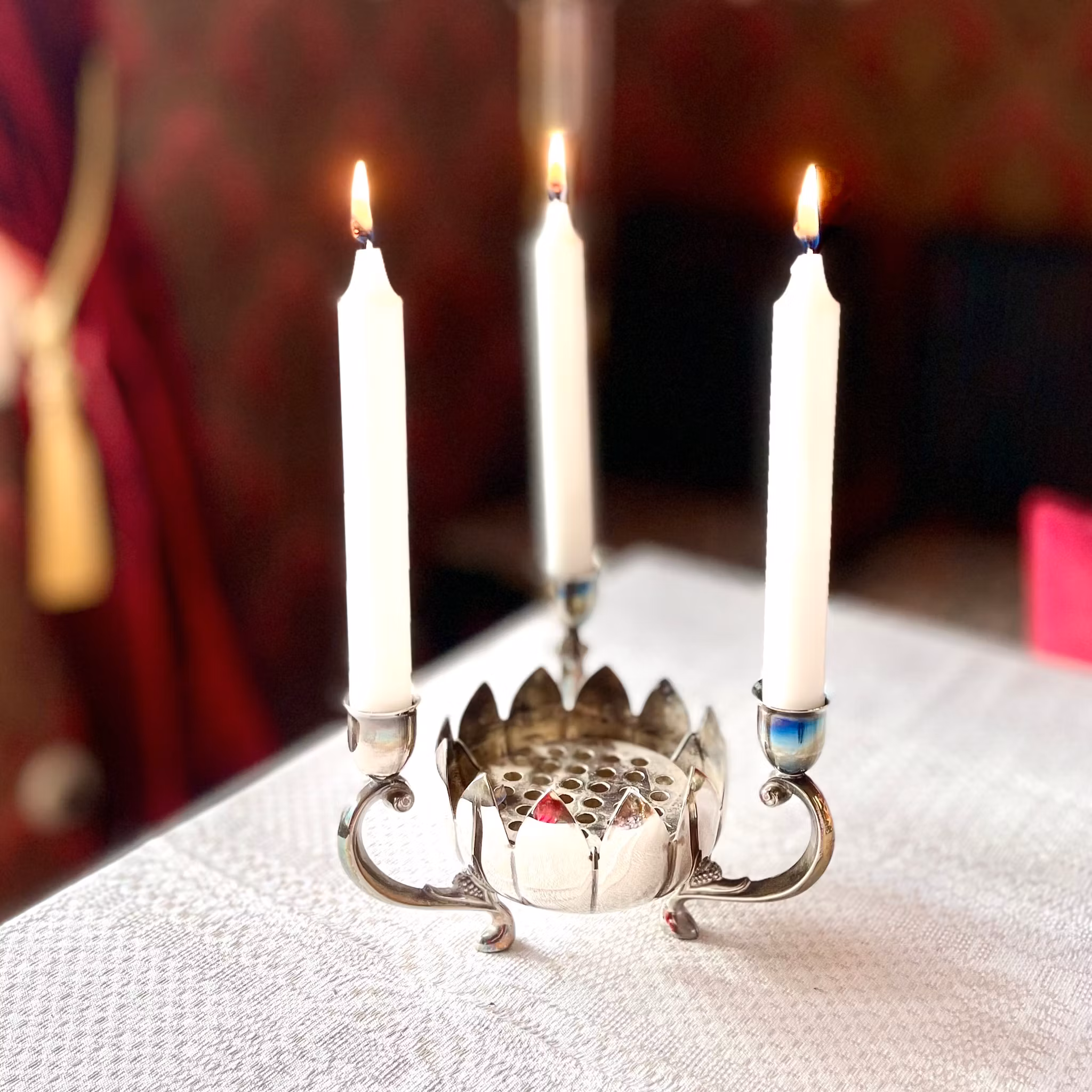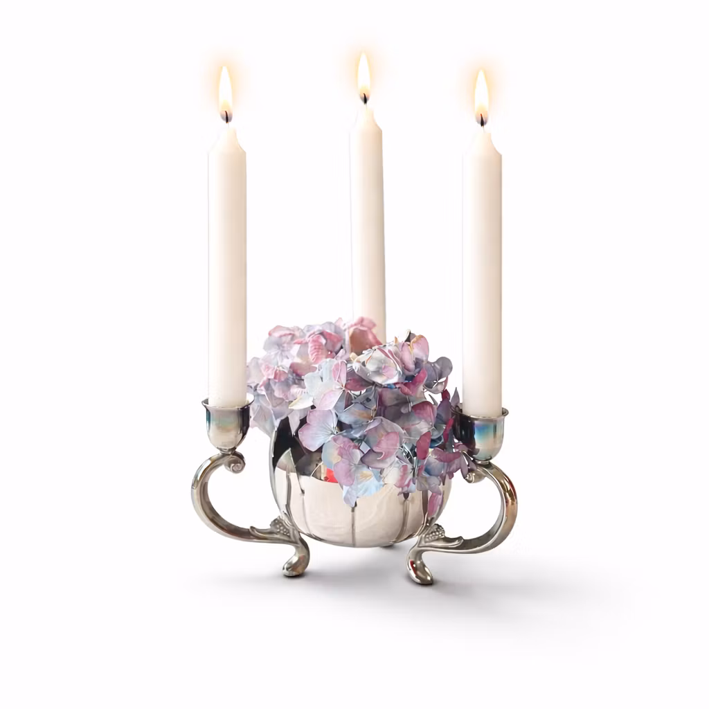 Bedårande näckrosformad trearmad ljusstake i silverfärgad metall med vas i mitten. I vasen finns en löstagbar blomsterinsats. Bruksslitage, går att putsa upp. Bredd 19 cm, höjd 12 cm.