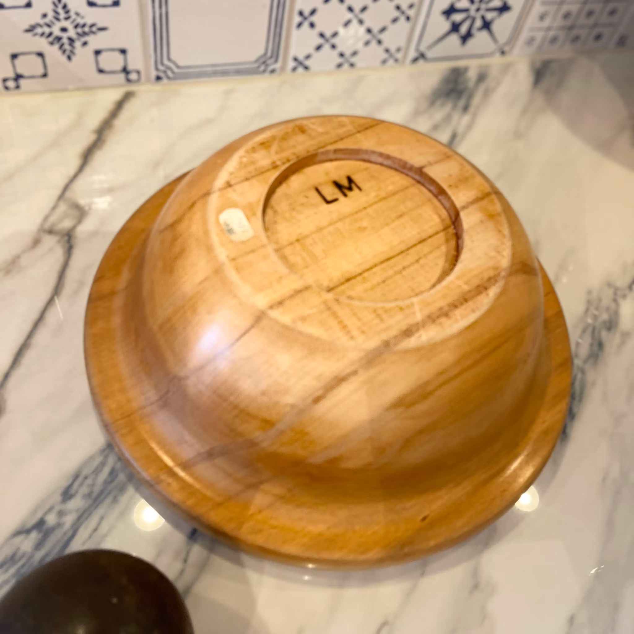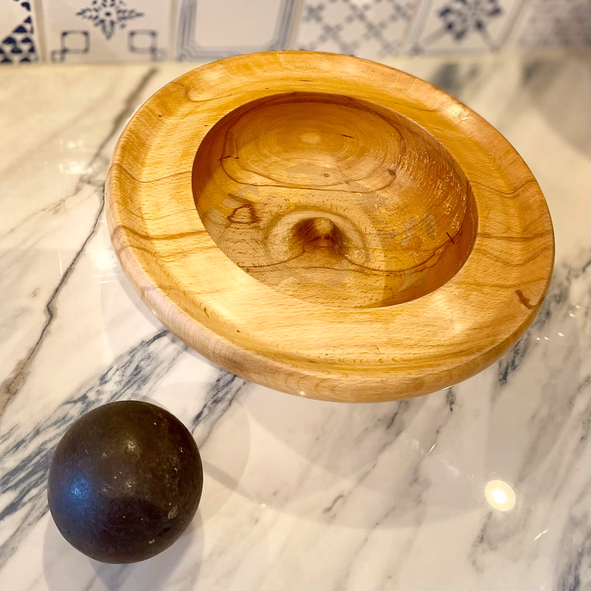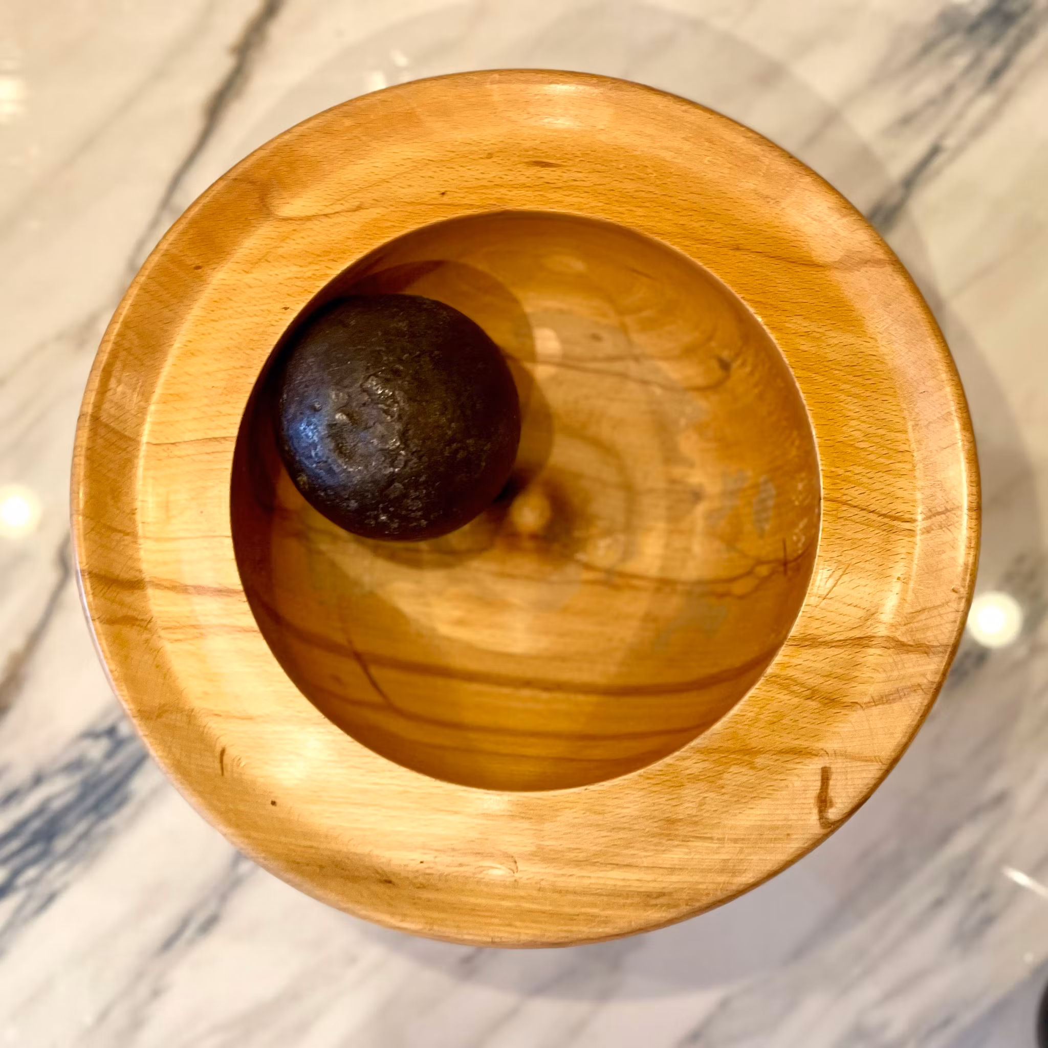 Ta din matlagning till nästa nivå med egen senapskula! Skål av trä ingår, märkt ”LM”. Bruksslitage. Kulan av järn. Skålens diameter 27 cm, höjd 9,5 cm.