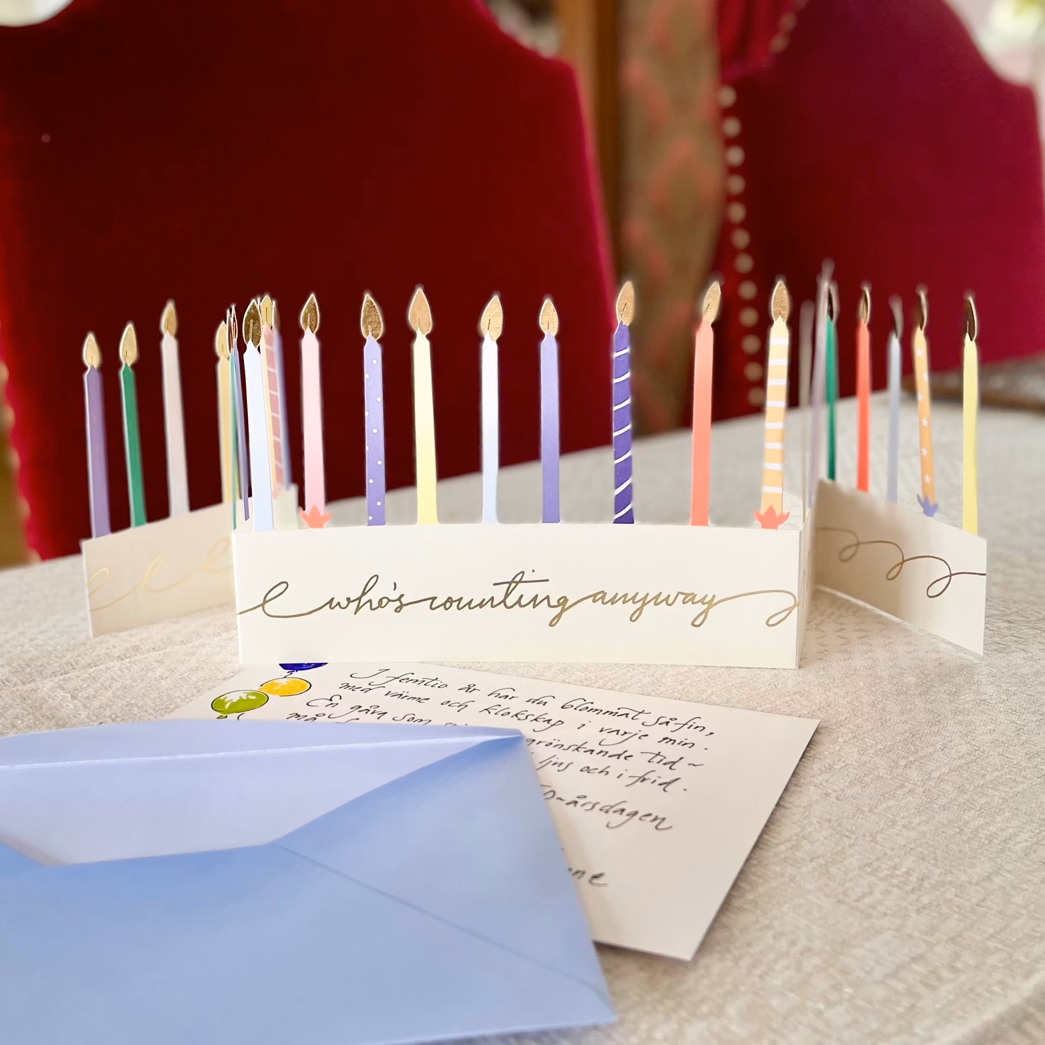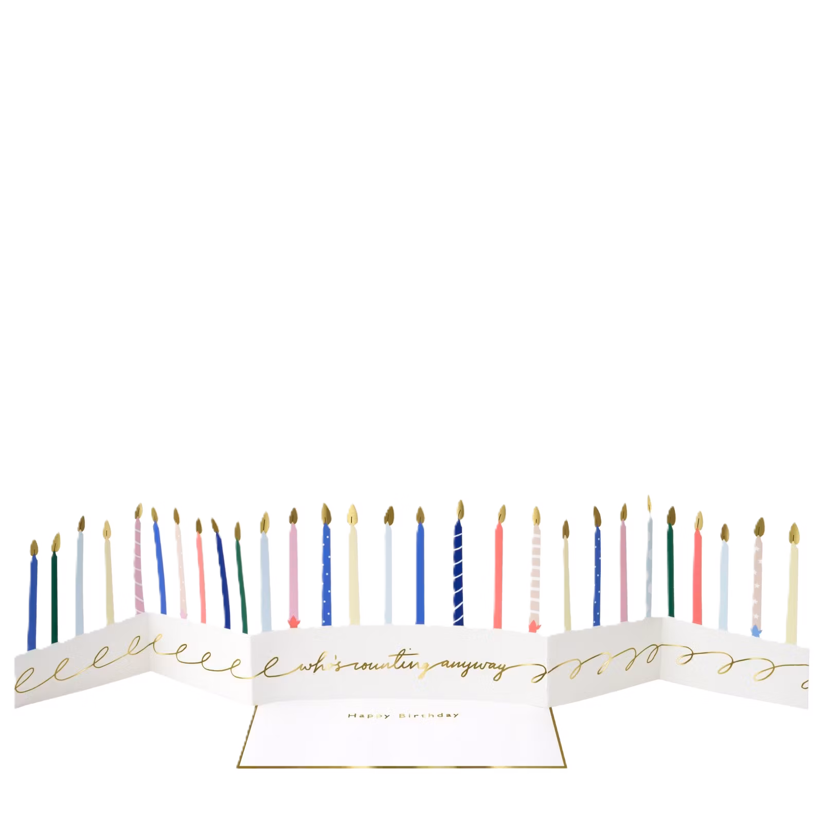 Fira någon ordentligt på födelsedagen med det här läckra kortet! De utstansade ljusen är frilagda och kan ställas för sig, kortet är enkelt och på ena sidan står det ”Happy Birthday” med guldfolierade bokstäver. Kuvert ingår.