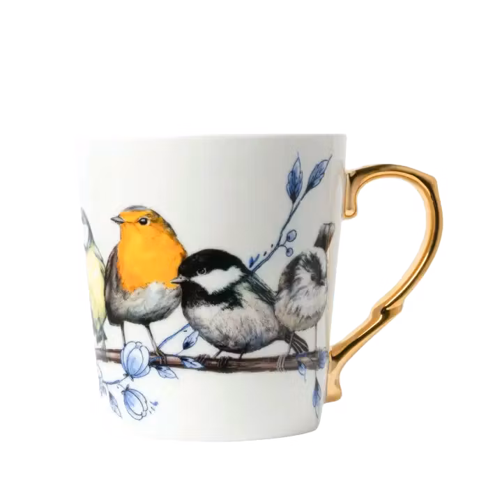 För fågelälskaren finns knappast en mer passande mugg! Vackra vinterfåglar sitter tätt tillsammans på den här ljuvliga muggen med guldöra och blåvit dekor. Tillverkad i Nederländerna. Handdisk, ej micro. Mått: 8,5 x 8,5 x 9,5 cm.